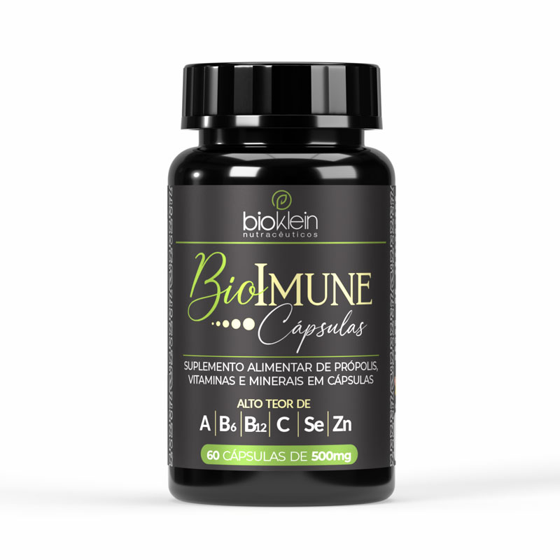 O BioImune da Bioklein é um suplemento alimentar de 500mg, comercializado em frascos com 60 cápsulas, desenvolvido para fortalecer o sistema imunológico. Sua fórmula combina extrato de própolis, vitaminas (A, B6, B12, C, D) e minerais (selênio e zinco) para ação antioxidante, proteção contra radicais livres e reforço das defesas naturais.
